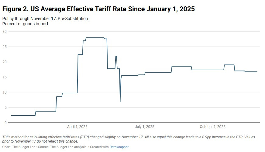 The trial-and-error finally produced an unsteady equilibrium in which everybody has figured out how much tariffing the market can actually handle. This chart from the Yale Budget Lab—seen everywhere in 2025—tells the story.