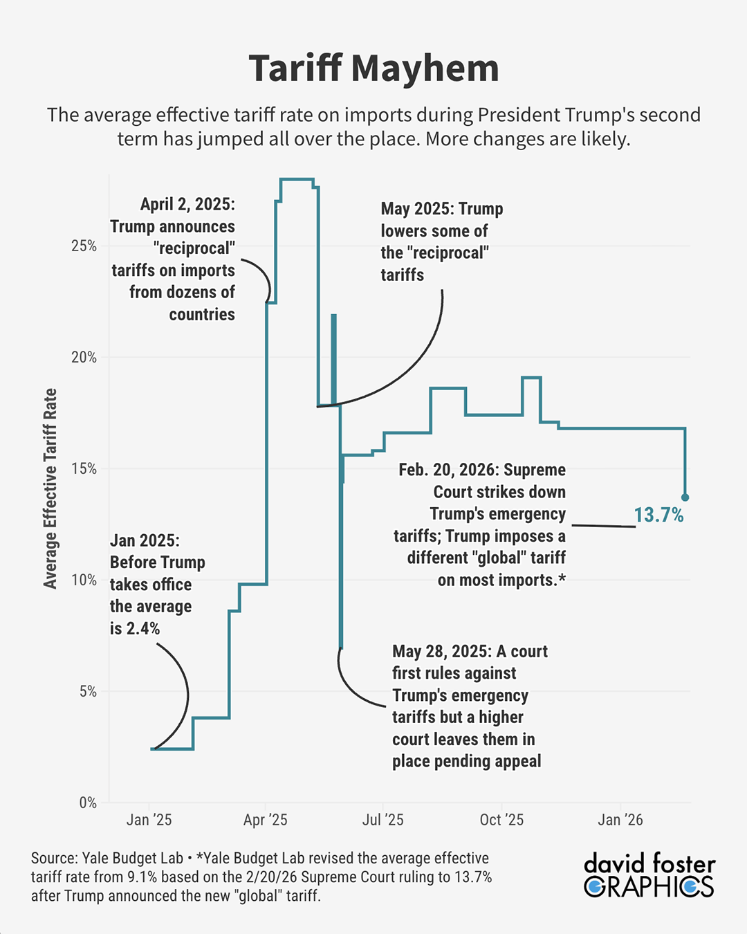 When the Supreme Court killed the emergency tariffs, the average import tax fell to 9.1%. With Trump’s new 15% “global tariff,” which is supposed to go into effect February 24, the average tax on all imports jumped back to 13.7%.
