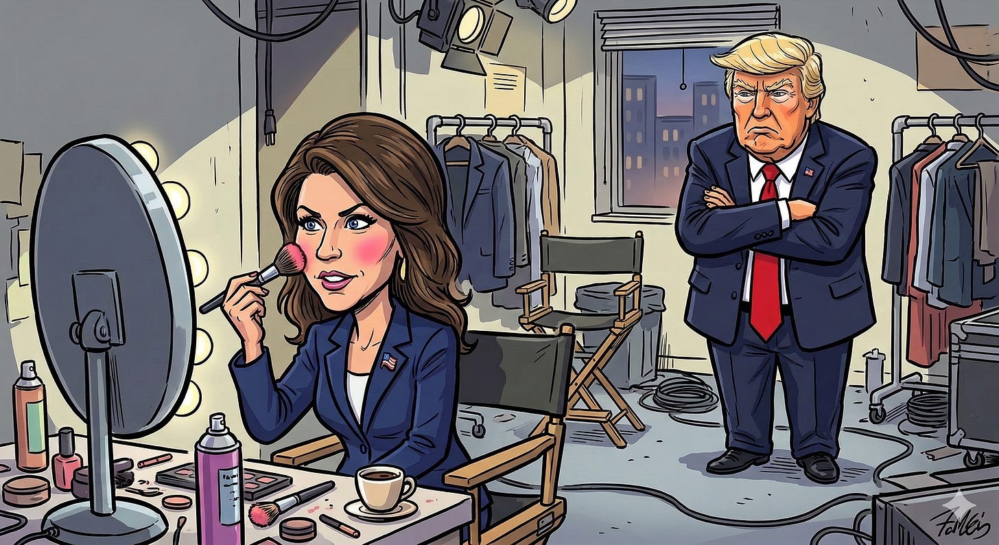 Noem will become special envoy to “The Shield of the Americas.” If anybody knows what that is, please explain. She seems happy, though. In a social media post, she thanked Trump for the demotion and said she’s looking forward to blah blah blah.
