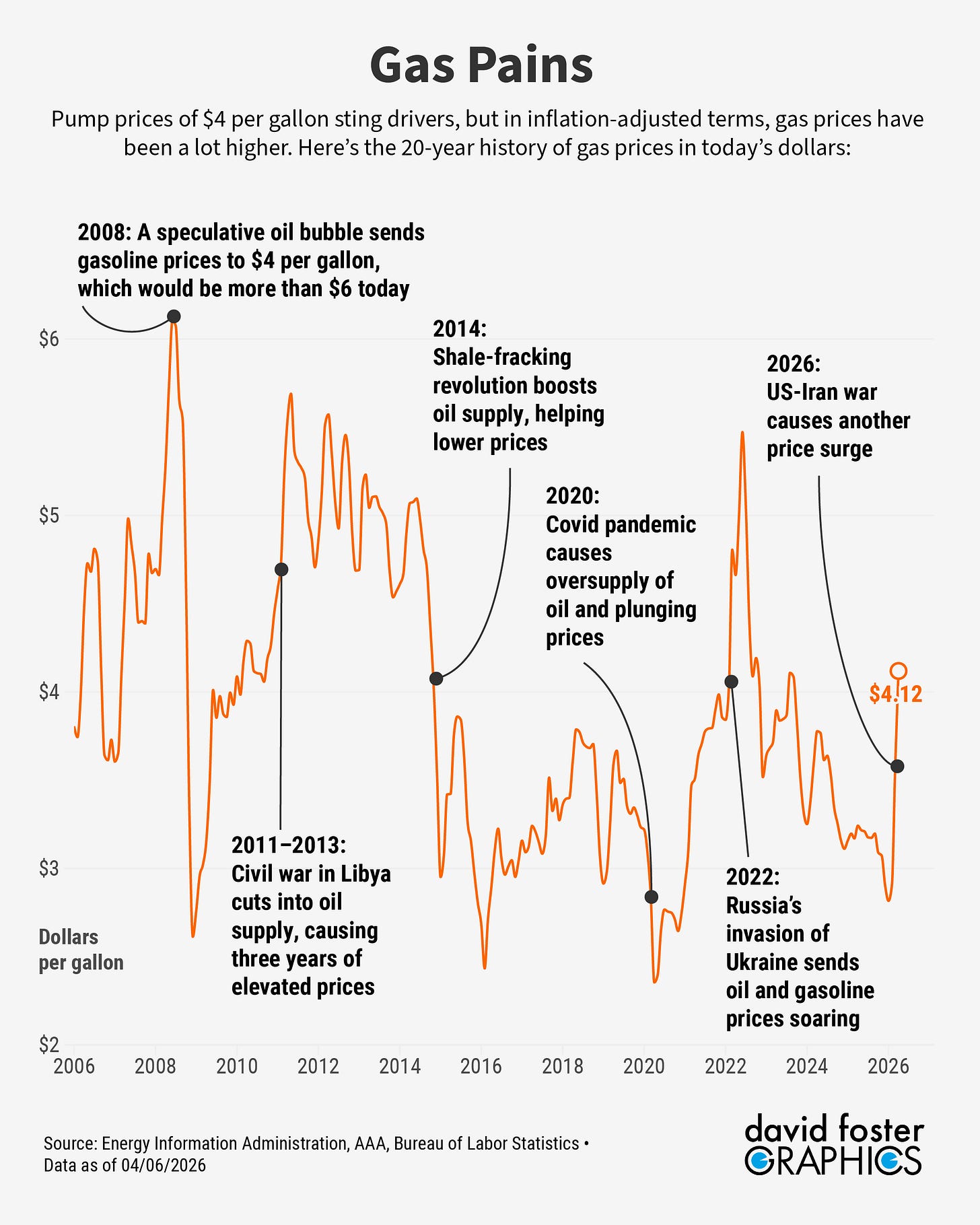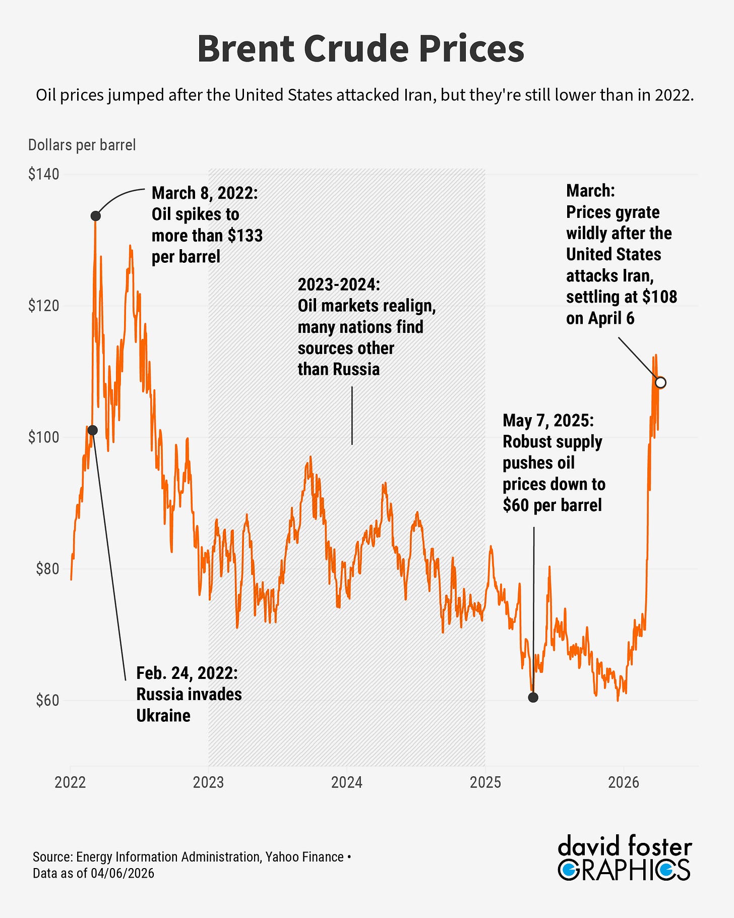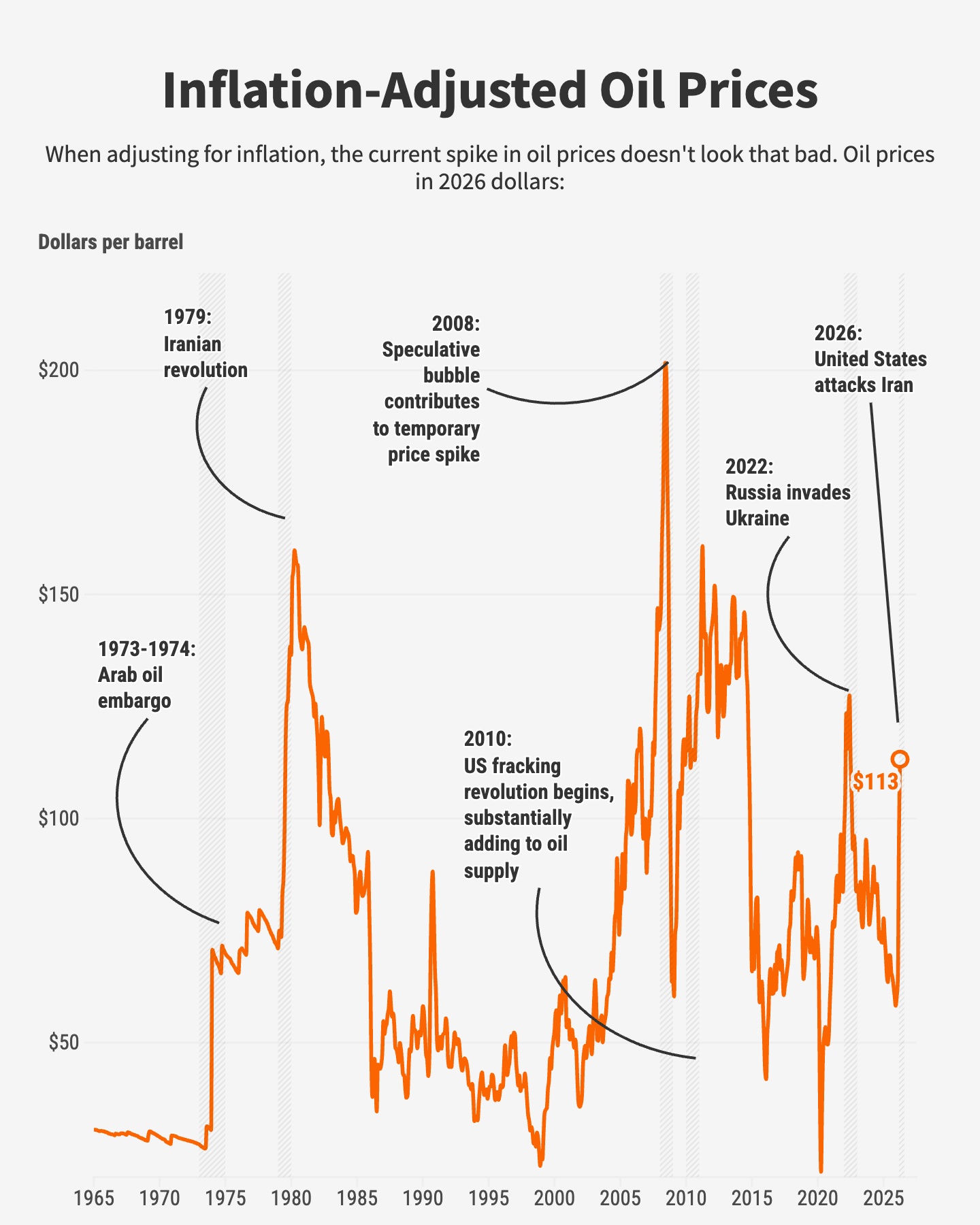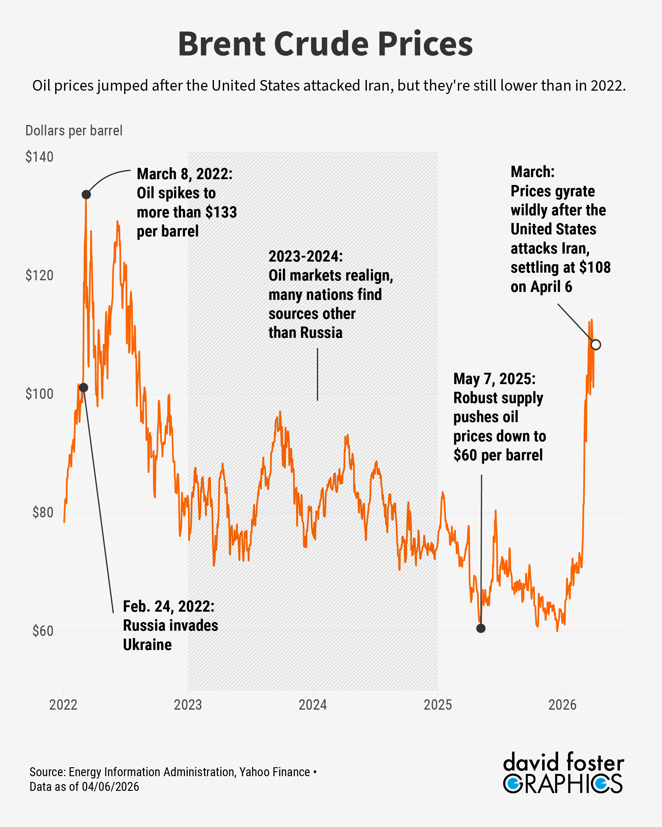 As everybody knows, the war President Trump launched against Iran on February 28 has caused a global energy crunch. Iran now controls which cargo ships transit the Strait of Hormuz at the mouth of the Persian Gulf. It’s letting a few ships through, but most Persian Gulf oil is stuck in place. The price of Brent crude has jumped from about $68 per barrel before the war to nearly $110 per barrel.