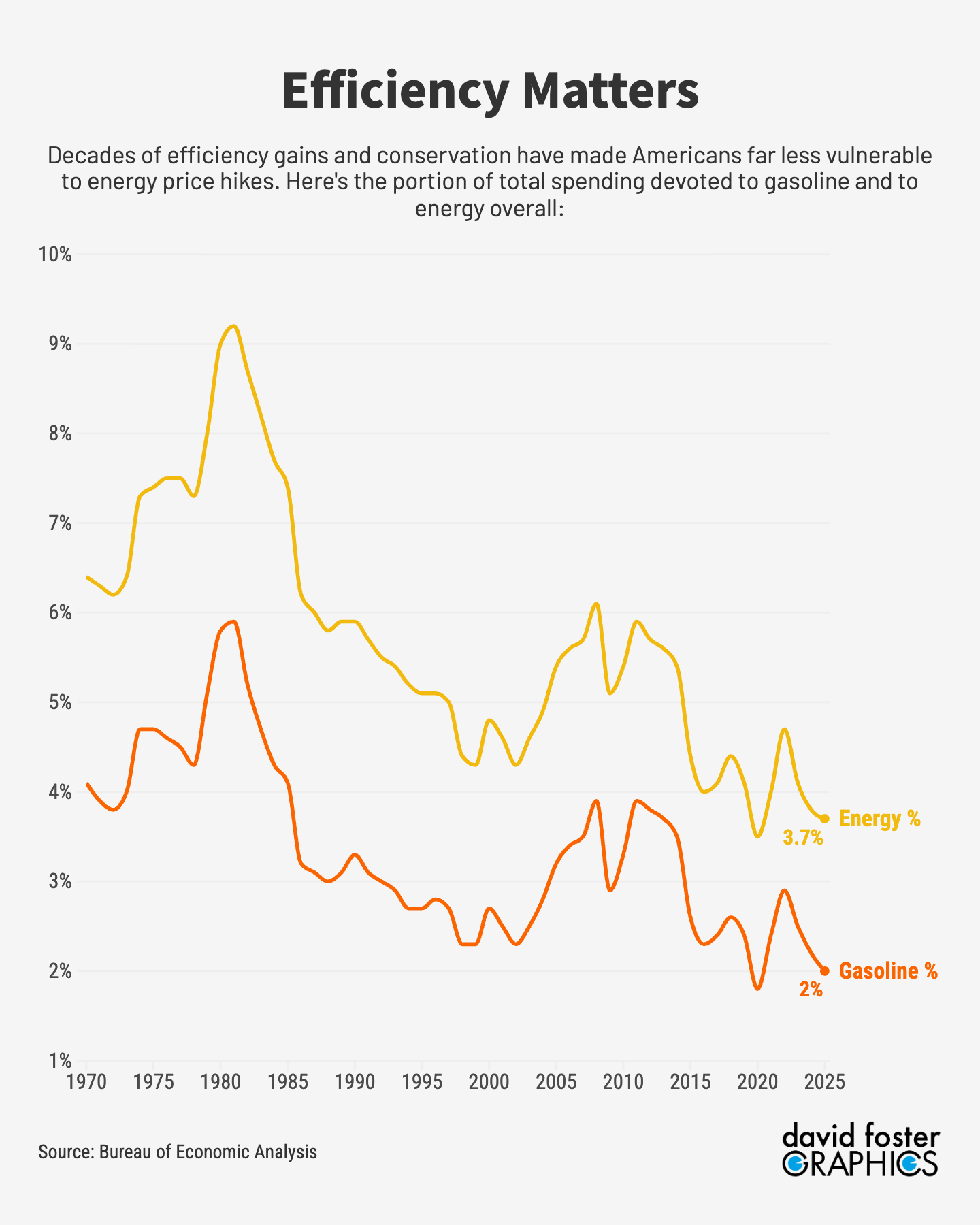 For the same reasons, ordinary Americans spend a lot less on energy than they used to, as a portion of their overall outlays. So higher energy prices don’t hurt as much as they did during the energy crises of the 1970s.