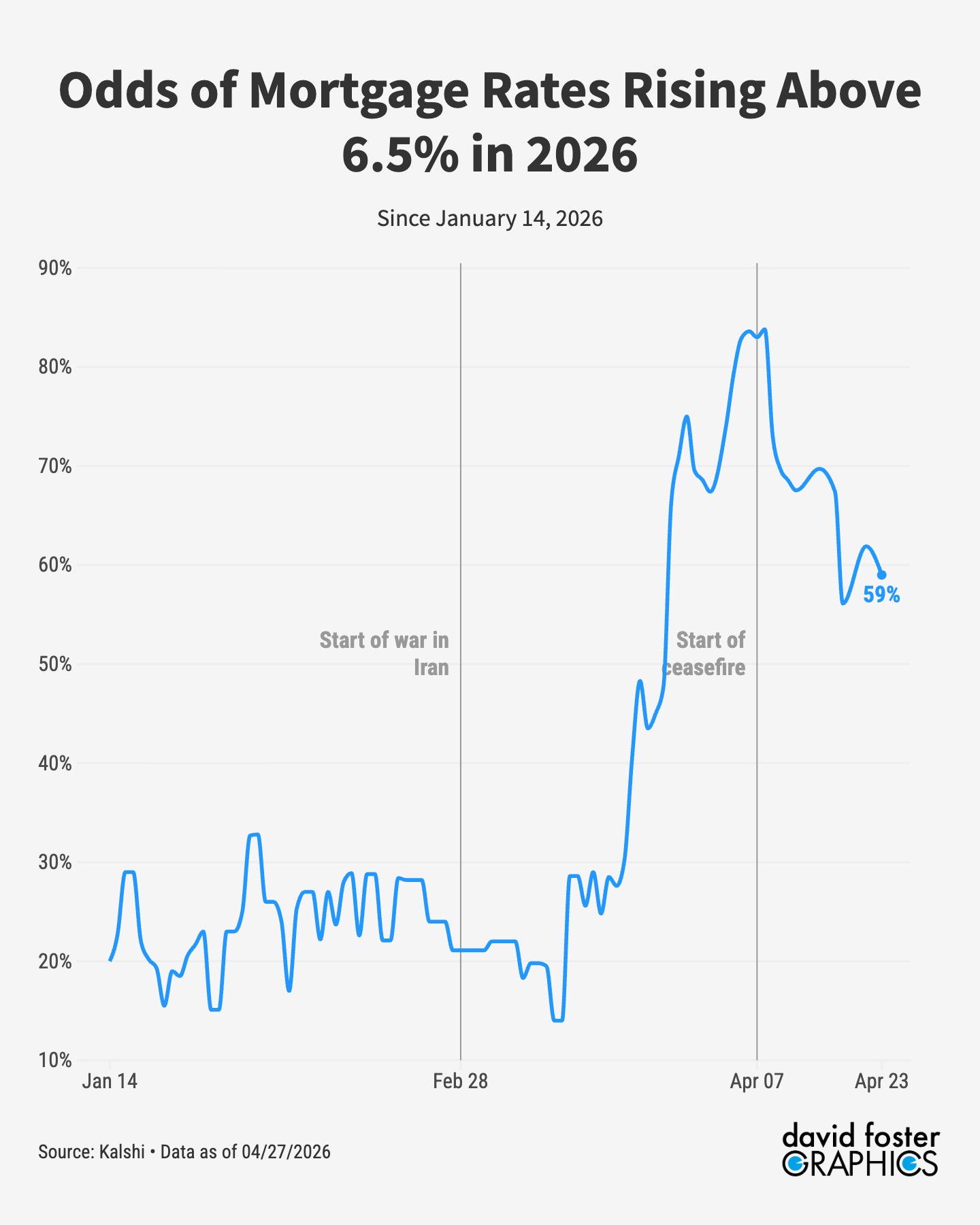 The outlook for interest rates is upward. Before the war, the odds of mortgage rates rising above 6.5% this year were just 21%, according to Kalshi. Now the odds of rates above 6.5% are 59%. Rates on most other loans will rise by about the same amount as mortgage rates.
