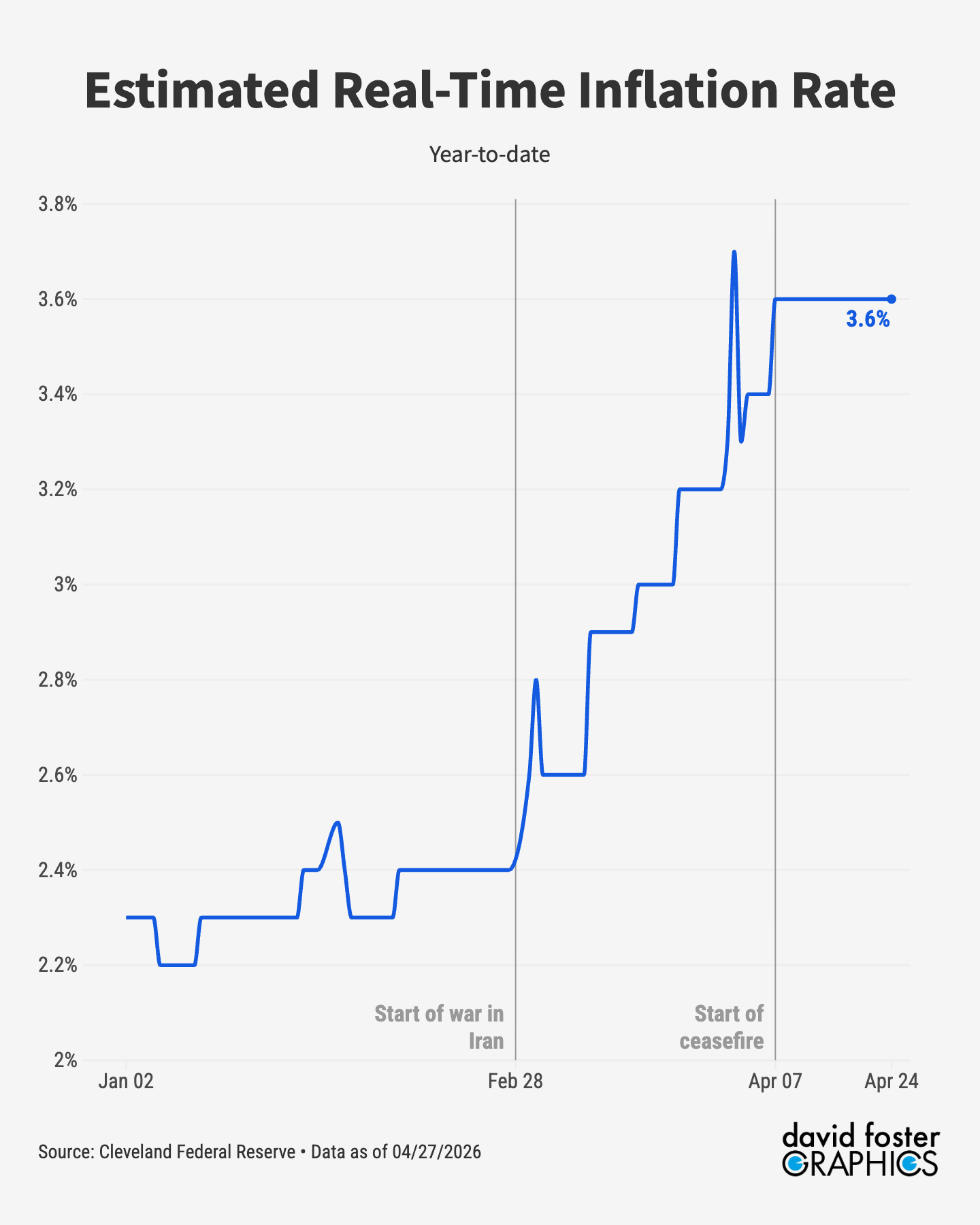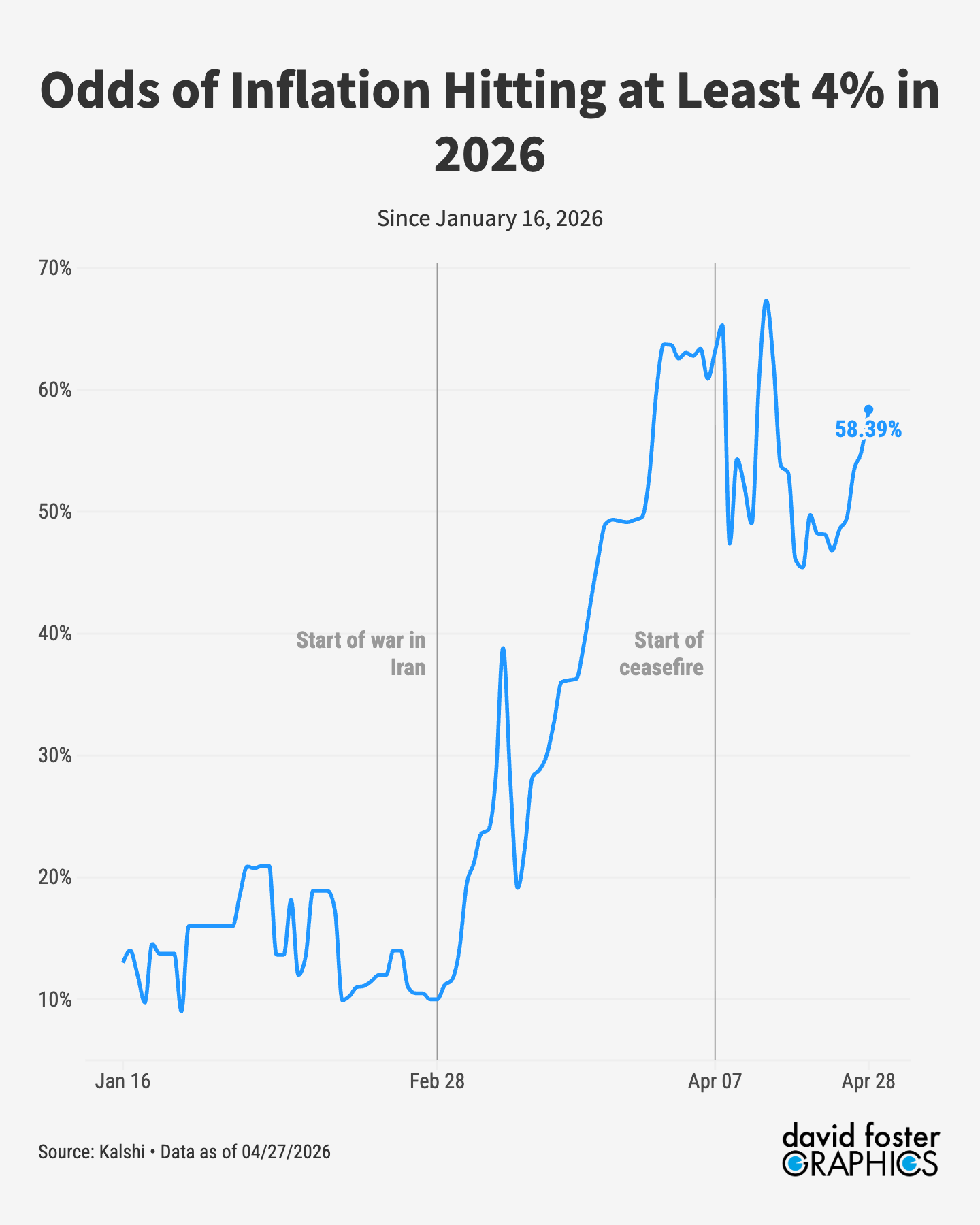 On the prediction market Kalshi, the odds of inflation hitting at least 4% in 2026 have jumped from just 10% before the war to 58% now.