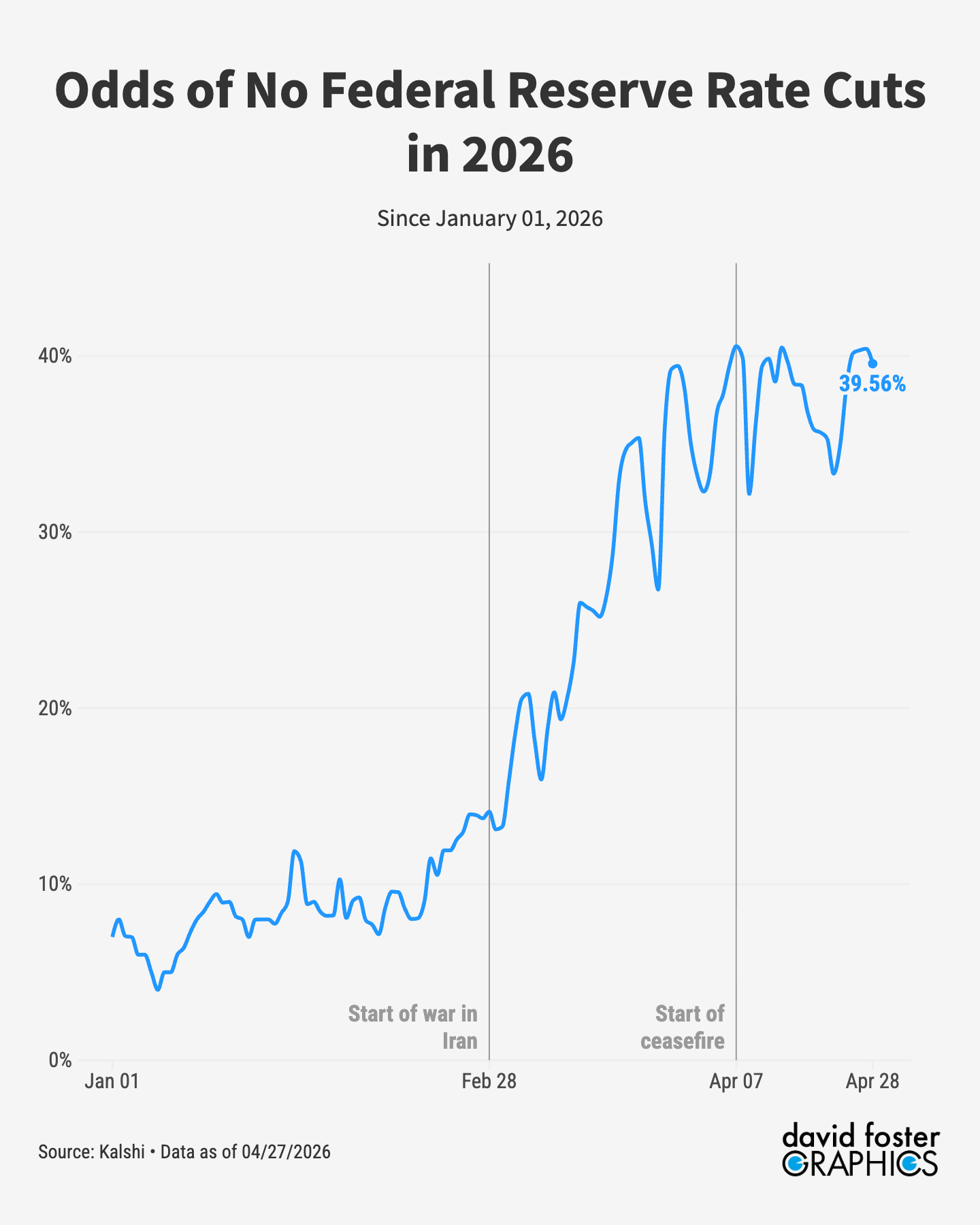Will the Federal Reserve cut interest rates? Before the war, prediction markets put the odds of Fed rate cuts this year at 86%. But the Fed rarely cuts rates when inflation is rising, and the war-related surge of inflation has lowered rate-cut odds to 60%. This chart shows the odds of no rate cuts in 2026, surging from 14% in February to 40% now.