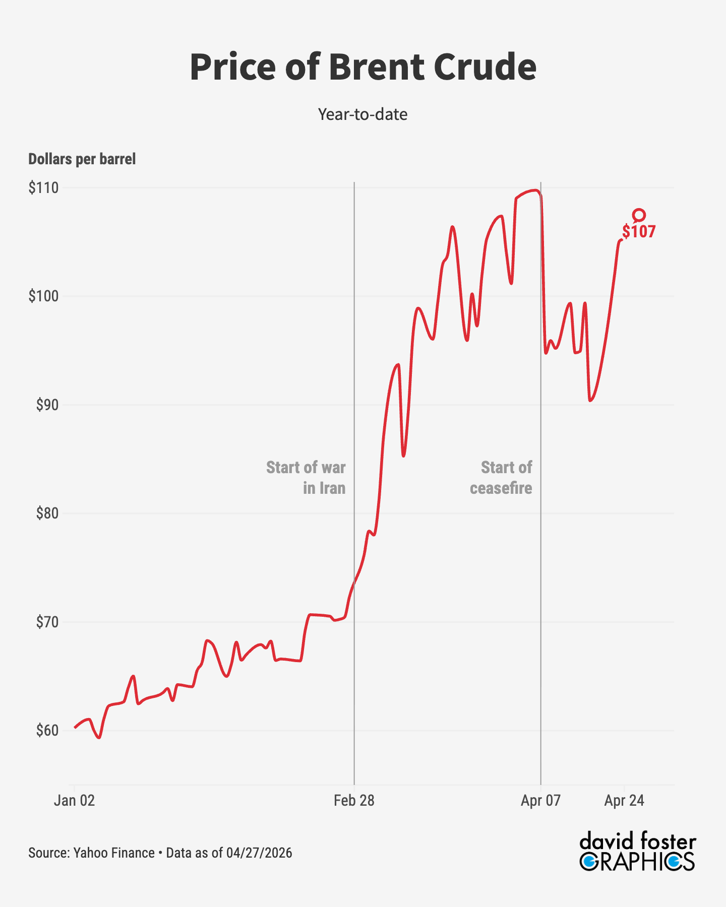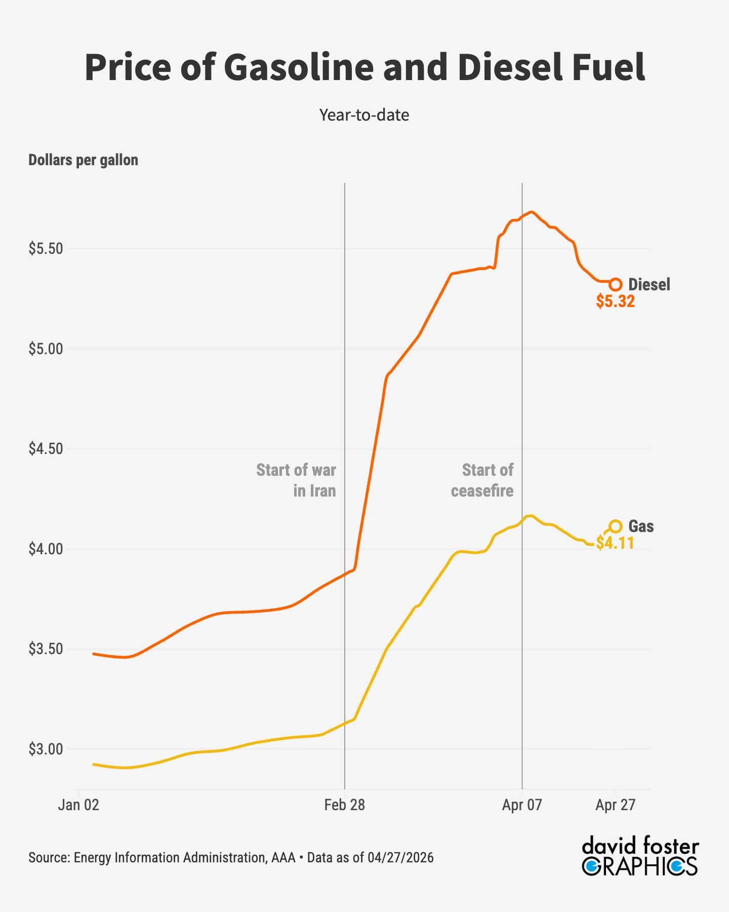 Gas prices have risen by more than $1 per gallon since the war started, to a national average of about $4.11. Diesel prices have risen by more, to about $5.32 per gallon. If oil prices stay above $100, gas and diesel prices will stay where they are and maybe go higher. A $1 jump in gas prices costs a typical driver about $40 a month in higher costs. If that lasts for the rest of the year, it will completely negate the larger tax returns many Americans received this year, on account of the 2025 tax-cut law.