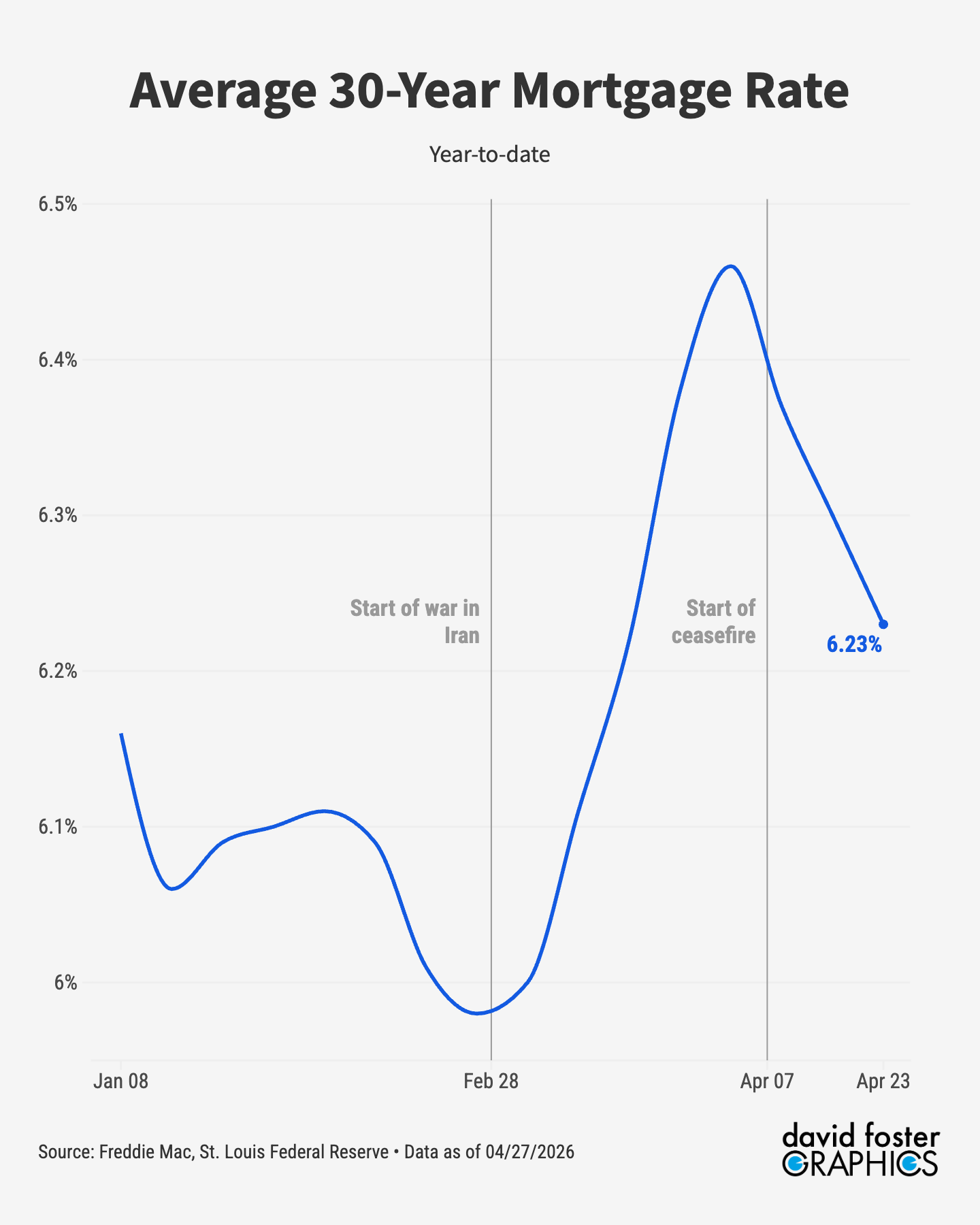 The average 30-year mortgage rate has jumped from about 6% before the war to nearly 6.23%. That’s enough to raise the monthly payment on a typical home by about $50.