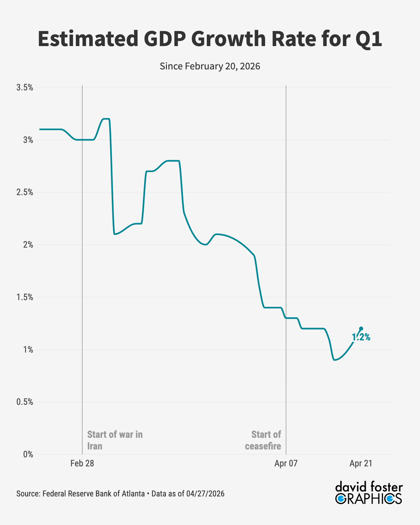 GDP growth will probably end up significantly lower because of the war. In late February, right before the war began, the Atlanta Federal Reserve’s GDP Now model estimated that first-quarter GDP growth was 3.1%. The estimate has since fallen to just 1.2% growth in the first quarter. Some of that might be delayed spending or investment that will take place later in the year. But some of that lower growth comes from canceled spending that won’t get made up.