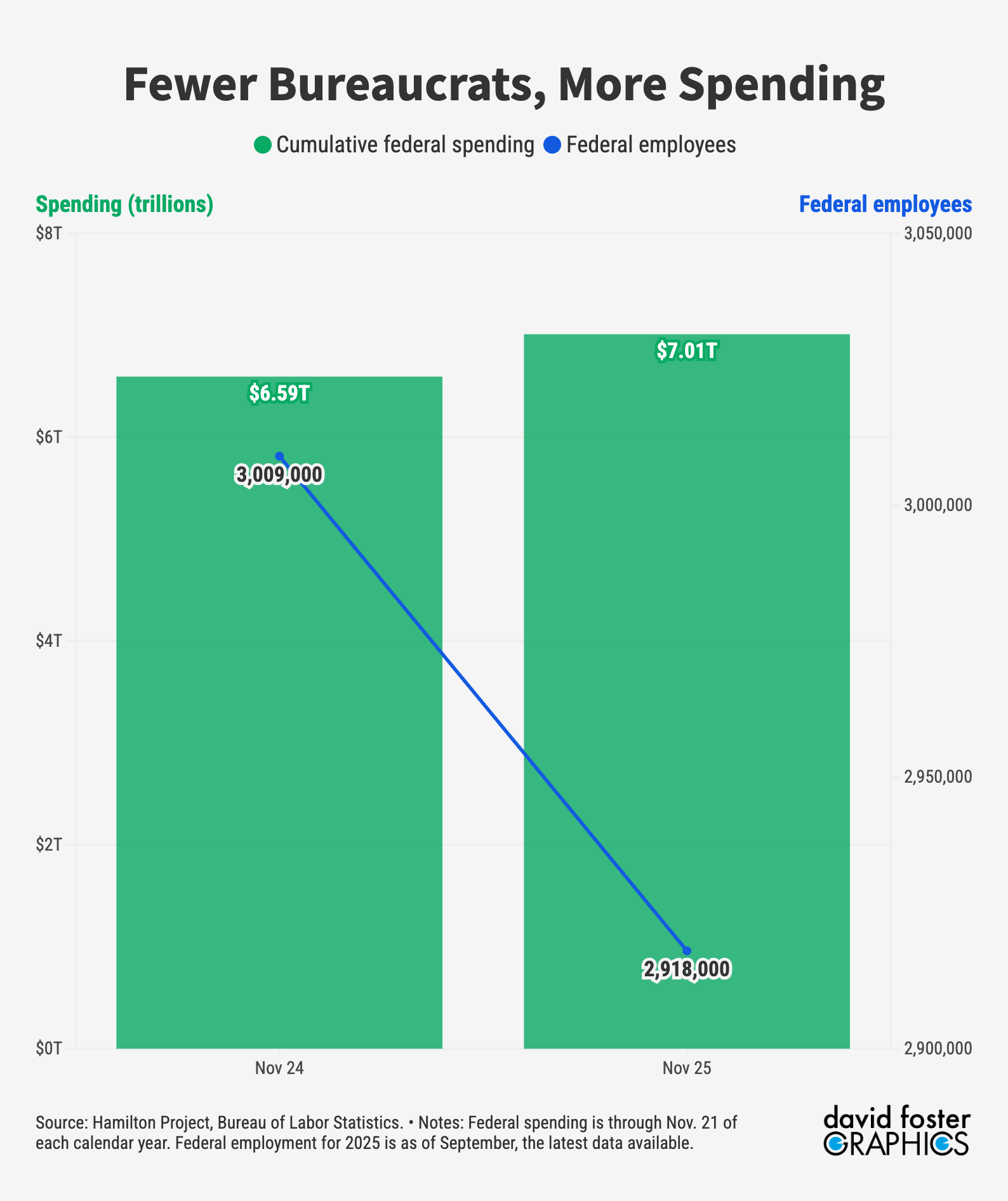 Federal spending in 2025 has totaled more than $7 trillion, according to daily tracking by the Hamilton Project. At the same point in 2024, federal spending was just $6.6 trillion. So spending is about 6% higher this year, even though there are fewer federal workers.