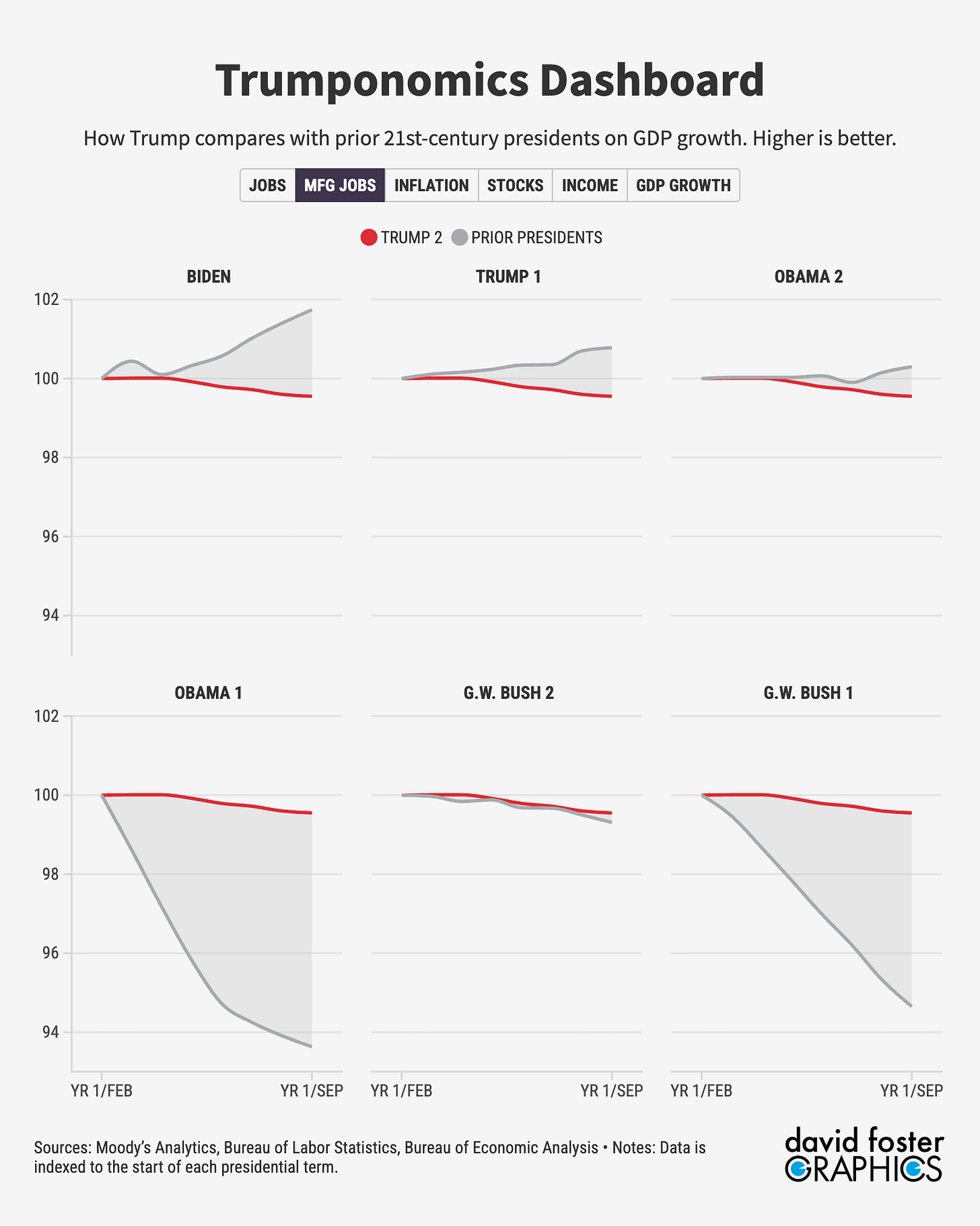 This is where you can decide for yourself. The Pinpoint Press Trumponomics Dashboard lets you compare the Trump economy with that of all the other US presidents since 1977, at the same point in each presidential term. We track six key metrics using data provided by Moody’s Analytics: Overall employment, manufacturing employment, inflation, stock-market performance, income growth and GDP growth. David Foster provides the graphics and maintains an interactive version for anyone who wants to play around with the tabs.