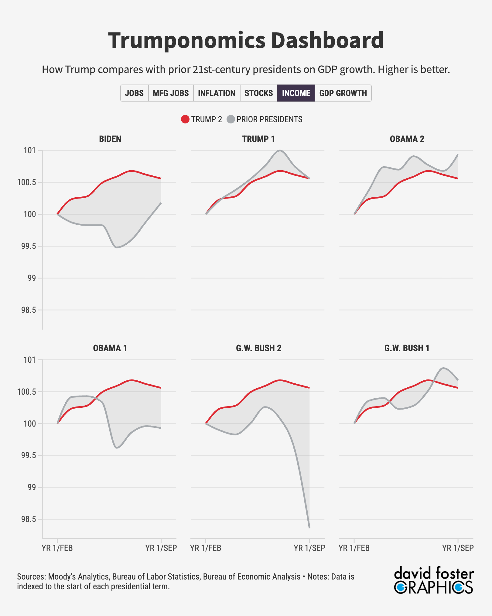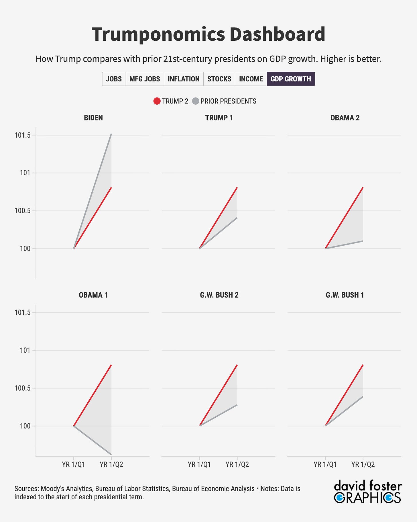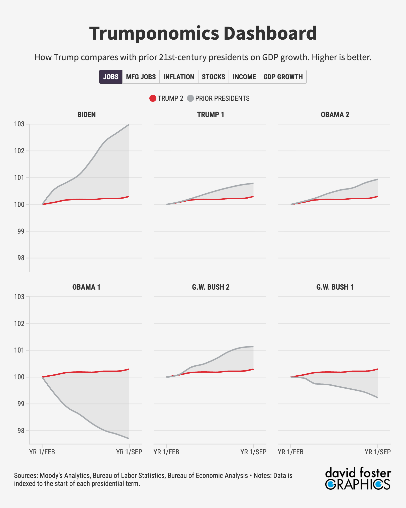 The charts below show the Trump economy compared with other 21st century presidents, starting with George W. Bush in 2001. For data going back to the 1970s, check out the interactive graphic.