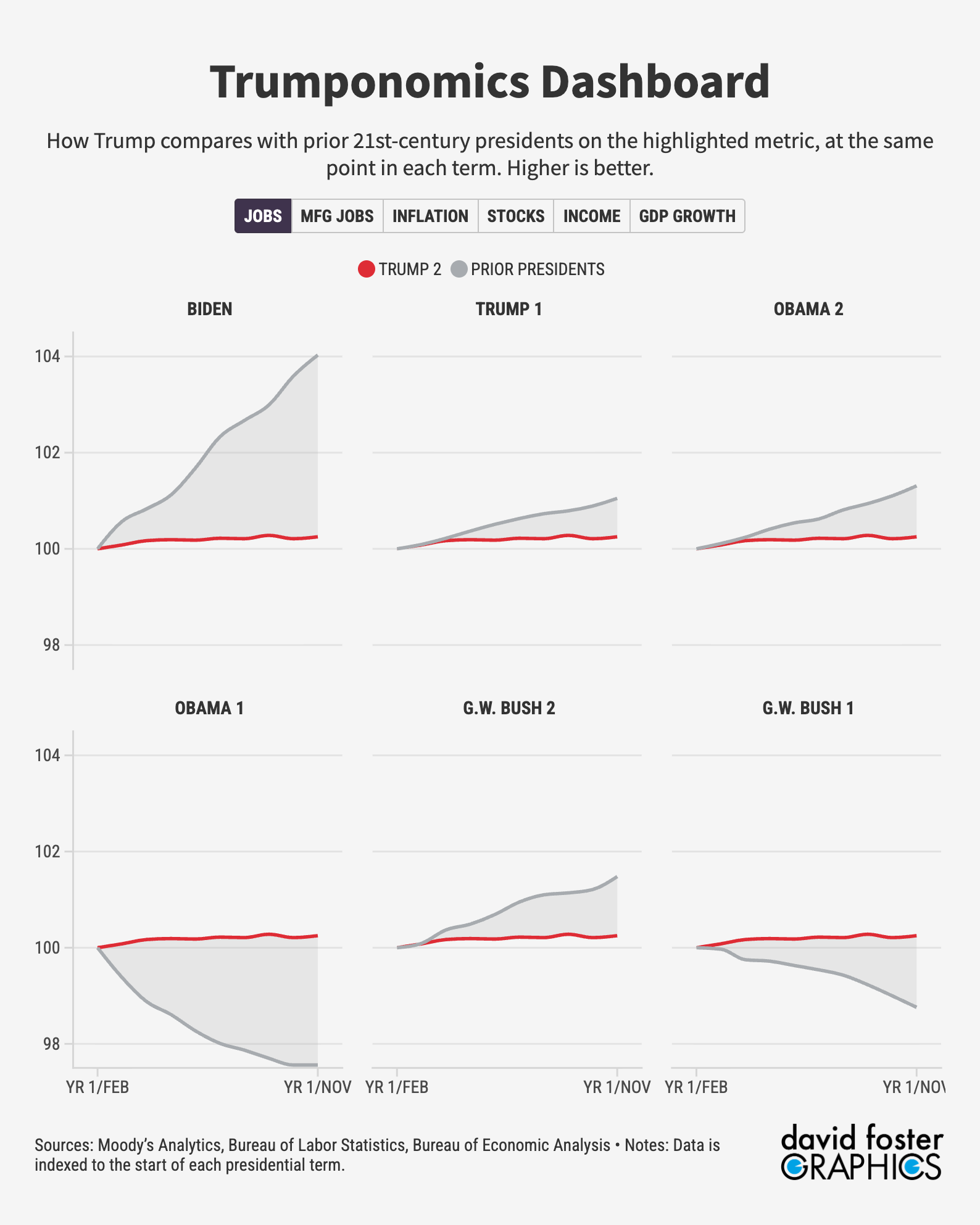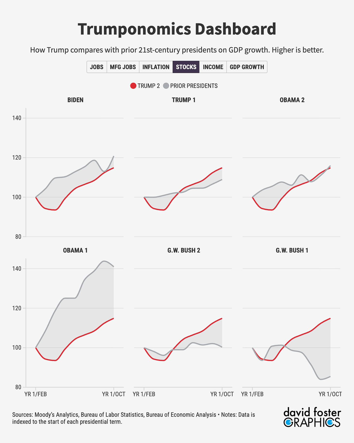 We update this data at least once a month, usually around the time the monthly jobs report comes out. The data is indexed to the beginning of each presidential term, so it shows how the economy changed from the time each president took office. That allows apples-to-apples comparisons among the presidents.