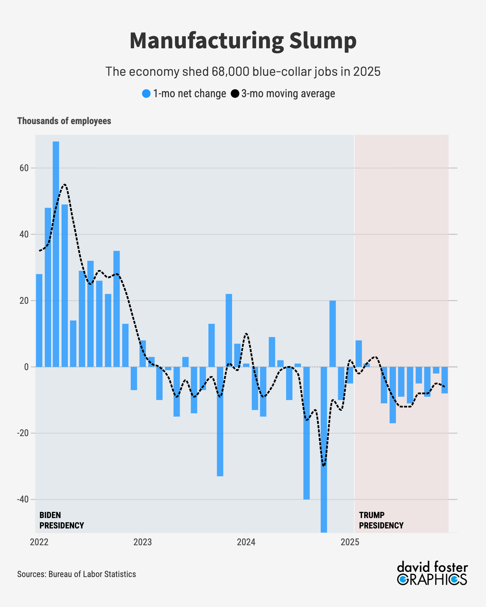 The manufacturing workforce is shrinking, with a loss of 68,000 jobs in 2025. That trend isn’t new; the sector lost 105,000 jobs in 2024. But a stated goal of Trump’s import taxes is to revive American manufacturing, and it isn’t happening.