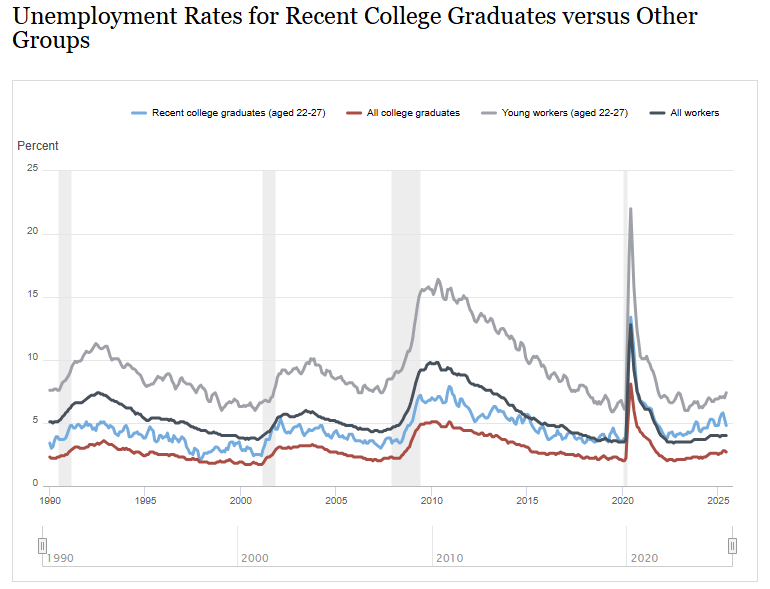 Young workers may have felt it first. The unemployment rate for college grads aged 22 to 27 is nearly a full percentage point above the rate for all workers, according to the New York Federal Reserve. That’s a sharp downgrade for America’s future taxpayers. For the 30 years prior to the Covid disruption in 2020, the unemployment rate for recent grads was 1.3 points lower than the rate for all workers, on average.