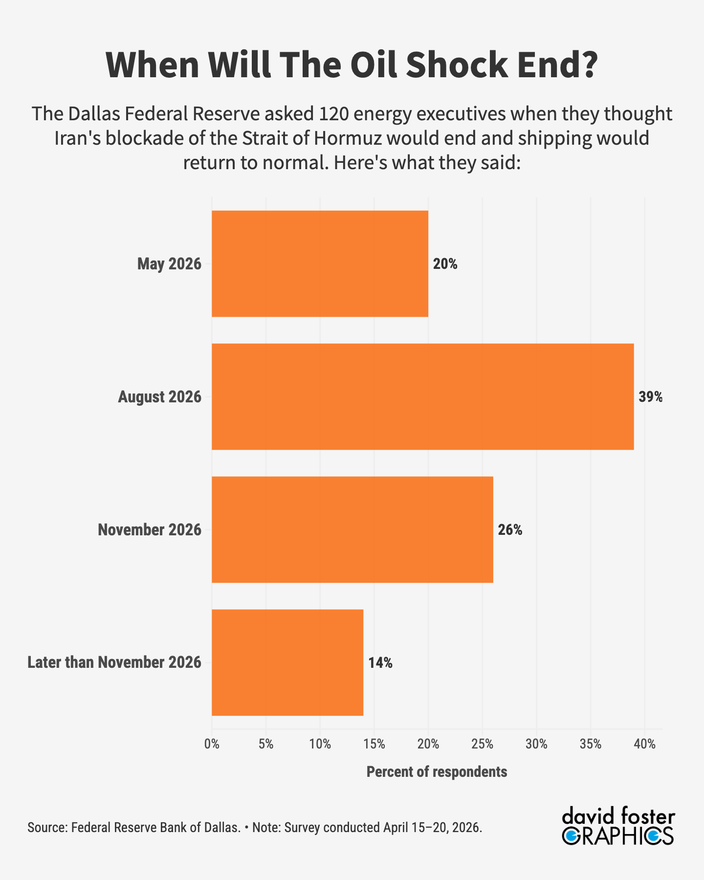 Higher for longer. That phrase normally applies to interest rates, but now it’s oil and other commodities that could remain uncomfortably high, indefinitely. The Dallas Federal Reserve ran a spot survey in mid-April, asking executives at energy firms when they expect tanker traffic through the Strait of Hormuz to normalize. Of 120 responses, 20% said things would get back to normal by May. But 79% said it would be August or later, including 14% who said it wouldn’t happen until after November.