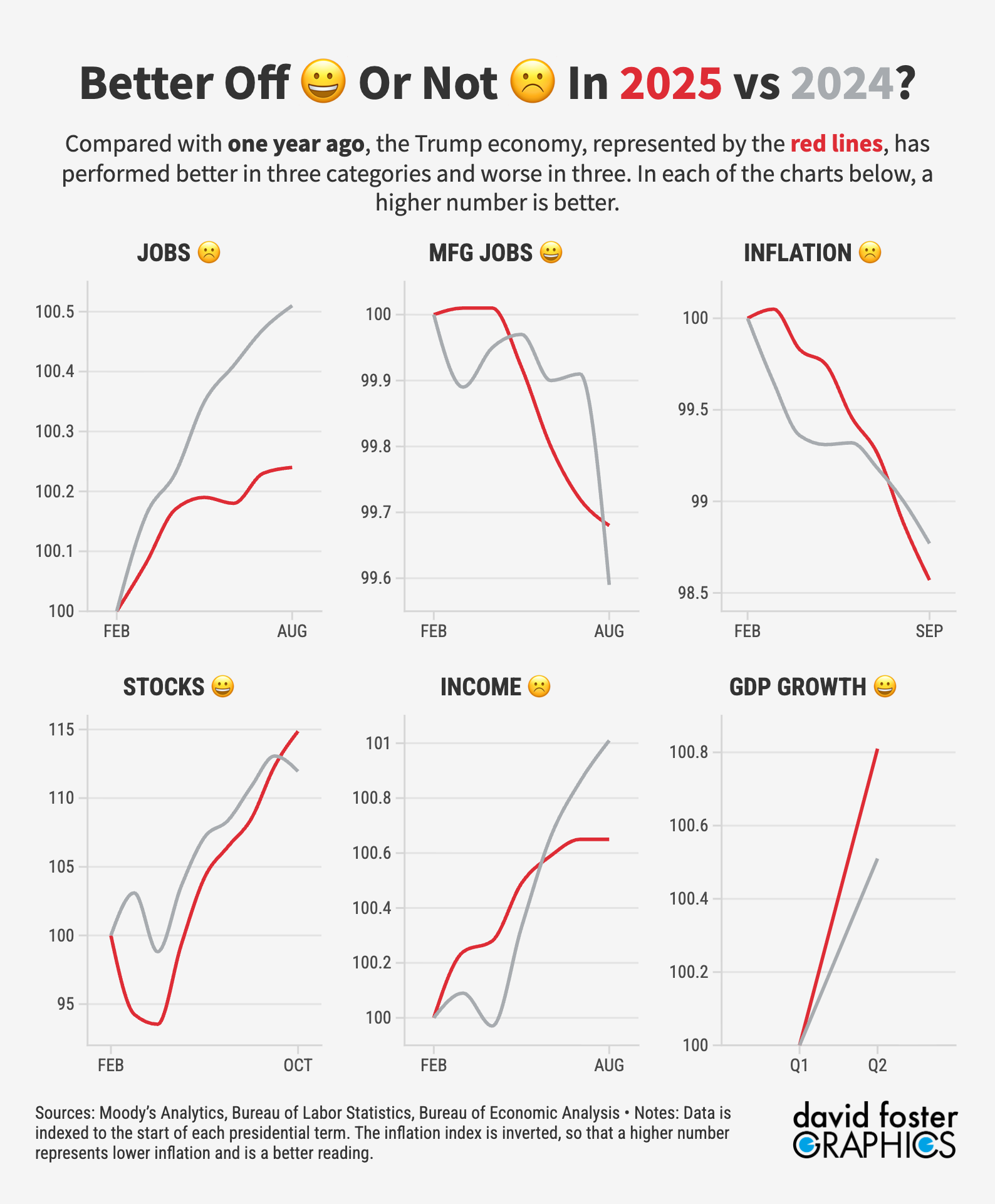 We also compare the current economy to the one from four years ago, and that comparison is worse for Trump. The 2025 economy wins on inflation and income growth, but lags on job and manufacturing employment, stock gains, and GDP. We rate the 2025 economy “somewhat worse” than in 2021. The four-year comparison will likely matter more when the next presidential election rolls around.