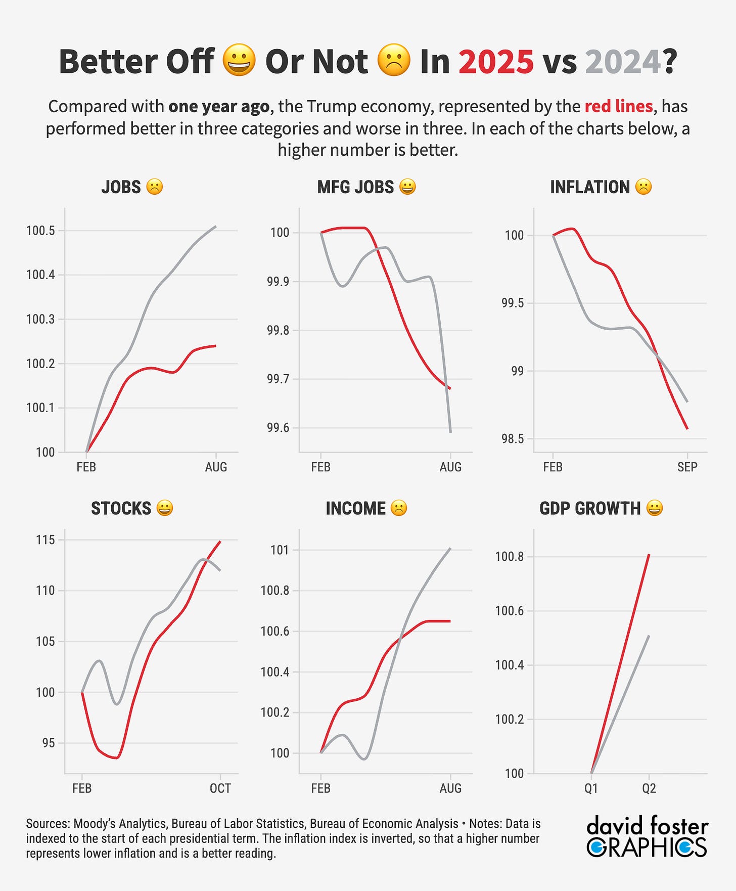 Our data measures change in those six categories since Trump took office in January. We’re not measuring raw levels of economic activity, but the increase or decrease during Trump’s second term. The pace and direction of change is how most people assess whether things are getting better or worse, and whether they’re getting ahead or falling behind.