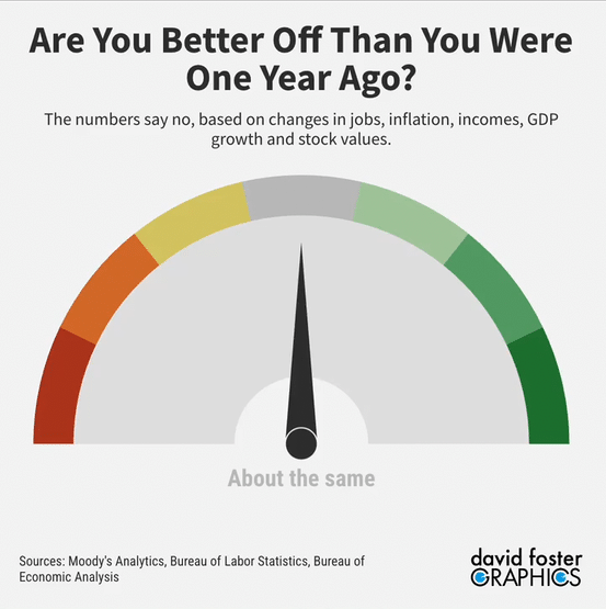 Compared with a year ago, Trump is doing better on three of those metrics and worse on three others. So on balance, the Better-Off Baromter says the economy is about the same as it was a year ago. Not so bad.