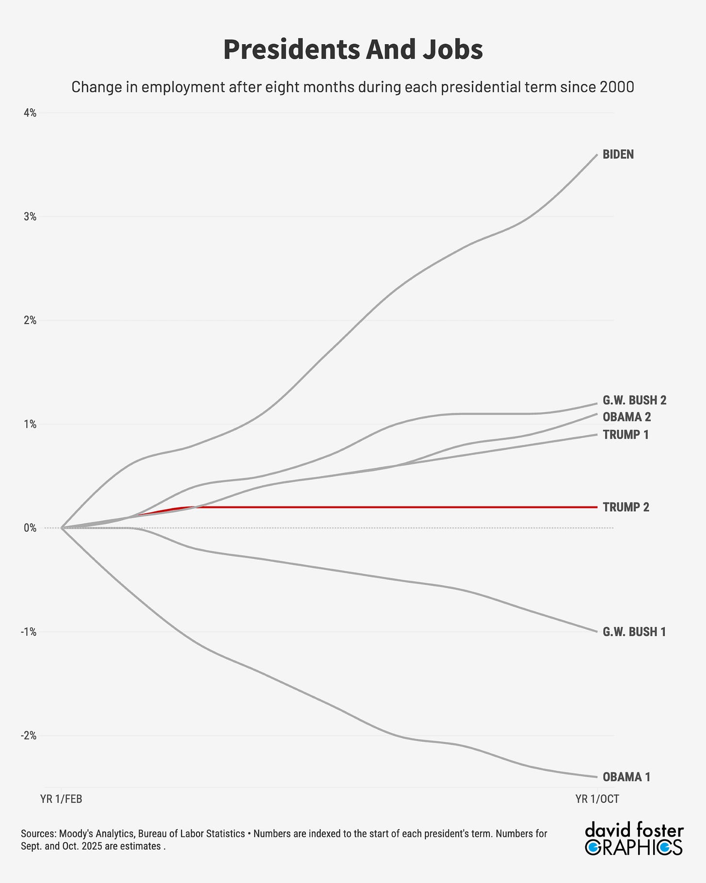 The “DOGE” cuts Trump initiated in the federal workforce earlier this year will probably work out to about 100,000 fewer federal jobs in October, most likely offsetting any gain in private sector hiring. Some cynical people might think those workers are just bureaucrats, so it’s not like they’re real jobs. But bureaucrats spend money like everybody else and fewer federal workers means less economic activity.
