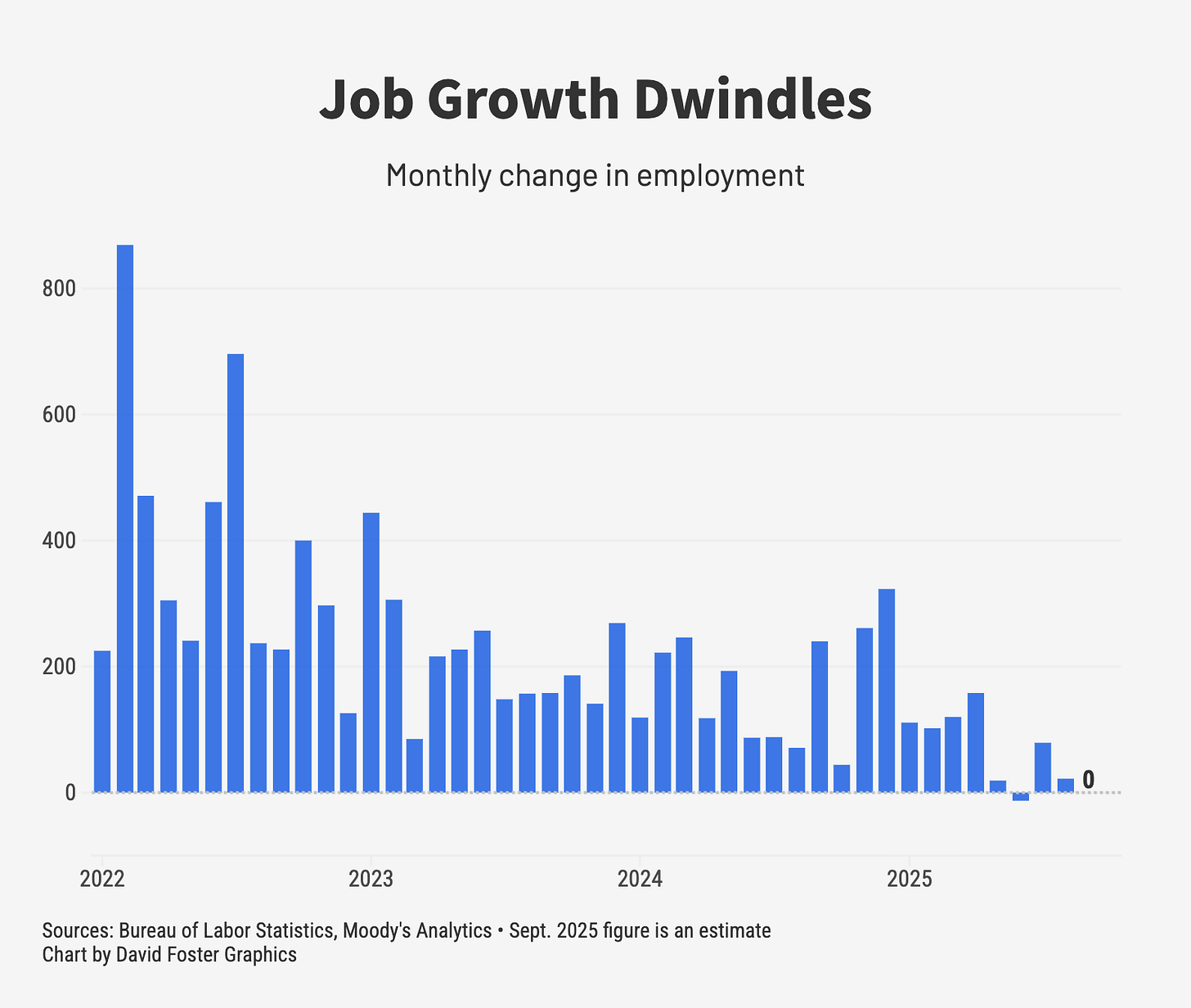 That would fit the trend of the last several months. The economy lost 13,000 jobs in June, the first negative print since the Covid pandemic in 2020. The average of the last three months has been a meager 29,000 new jobs. That’s a sharp drop from 2024, when employers added 154,000 new jobs per month, on average. Graphics guru David Foster put the numbers into this chart, using the Moody’s estimate for September.