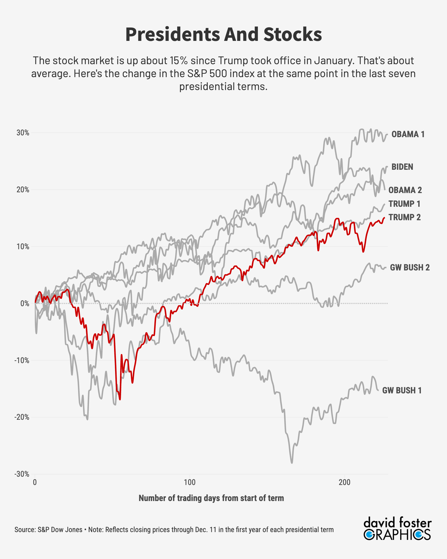 Even with the S&P hitting a new record high on December 11, the Trump stock market ranks 4th out of 7 compared with six prior presidents, at the same point in each term. Nobody’s complaining about the 15% Trump gain. It’s just not extraordinary.