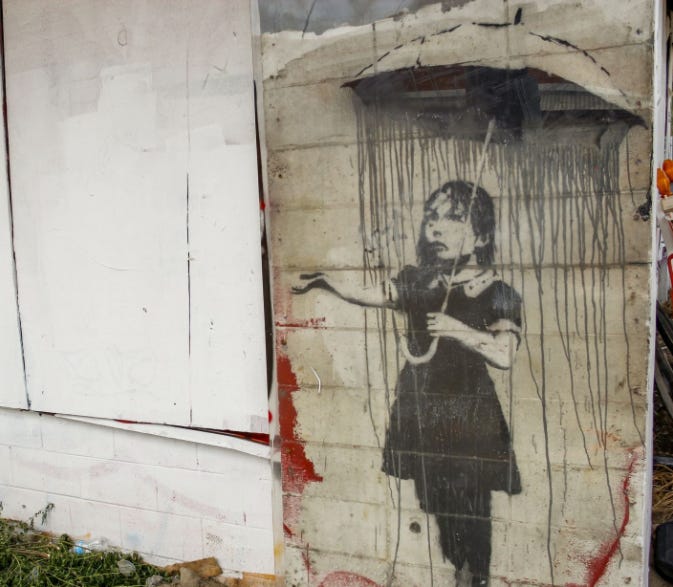 I visited New Orleans in 2019 and was delighted to come across a Banksy while going for a run. I didn’t know Banksy had been in New Orleans. Turns out he made more than a dozen stencils there in 2008, three years after Hurricane Katrina devastated much of the city. The mural below, known as Umbrella Girl, was on the side of a building on N. Rampart Street, intersecting Kerlerec, when I stumbled upon it. The owner of the building removed the mural in 2024 and is reportedly restoring and preserving it.