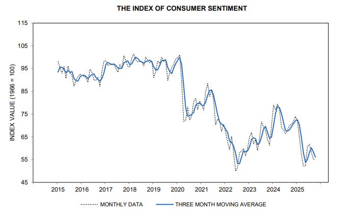 Even so, the overall Michigan sentiment index is depressed. It started the year at 71.7 but is now down to 58.2. That’s about the same level it was at in the middle of 2022, when inflation was at a 40-year peak of 9%. Other measures of confidence show more or less the same thing.