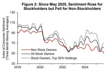 The Michigan data shows an important connection between a booming stock market and improved confidence for those who own stocks. In April and May, for instance, sentiment levels were similarly low for those who owned stocks and those who didn’t. That was a trying time in the market, with stocks down nearly 20% as President Trump rolled out punishing tariffs. Stock market losses basically made stock owners just as gloomy as those with no stocks.
