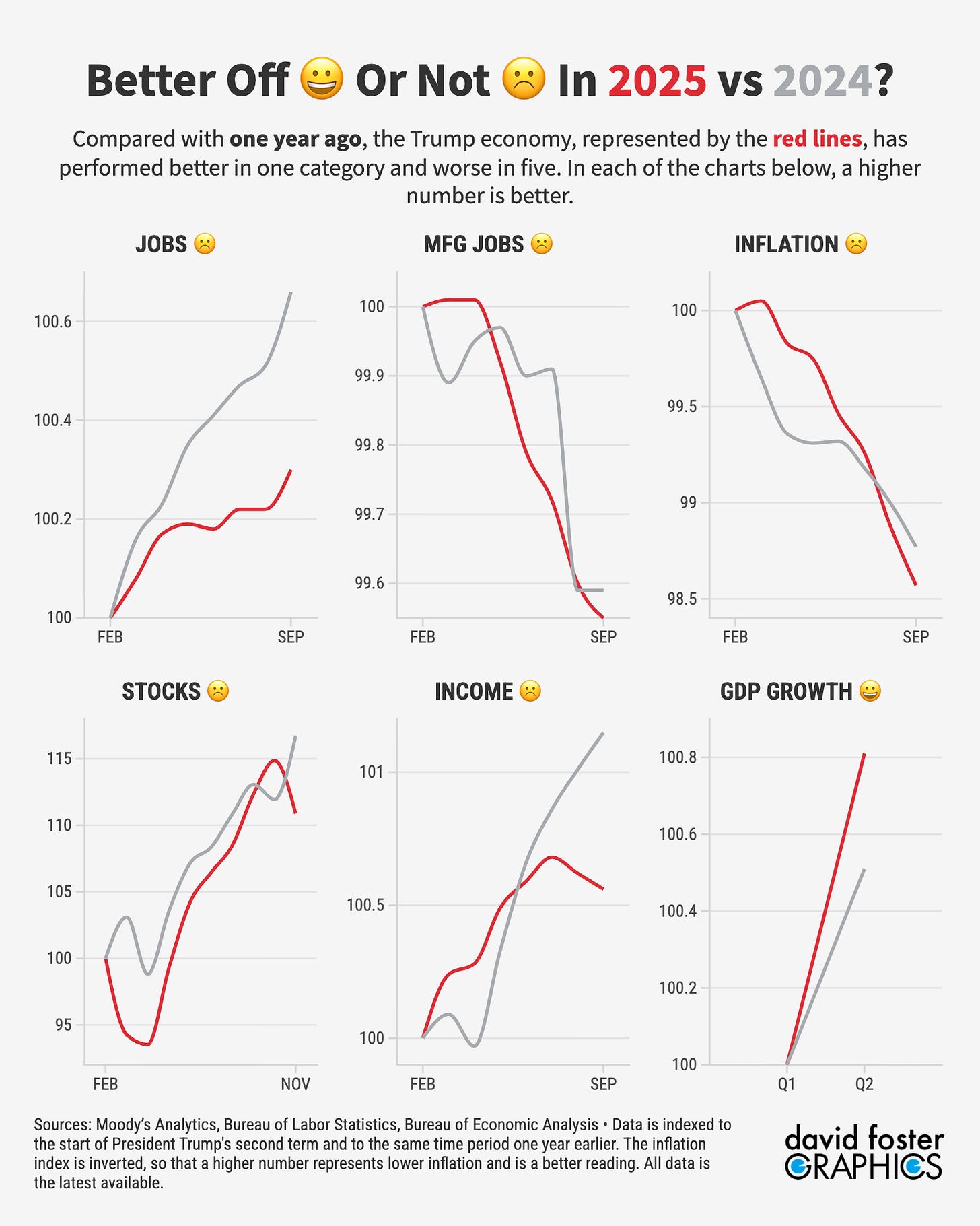 The momentum of the economy has slowed. The Pinpoint Press Better-off-Barometer shows that since Trump took office, the economy is performing worse than it was during the same time frame in 2024 in five out of six key economy categories: overall employment, manufacturing employment, stock values, income, and inflation. Only GDP growth is better than it was one year ago.