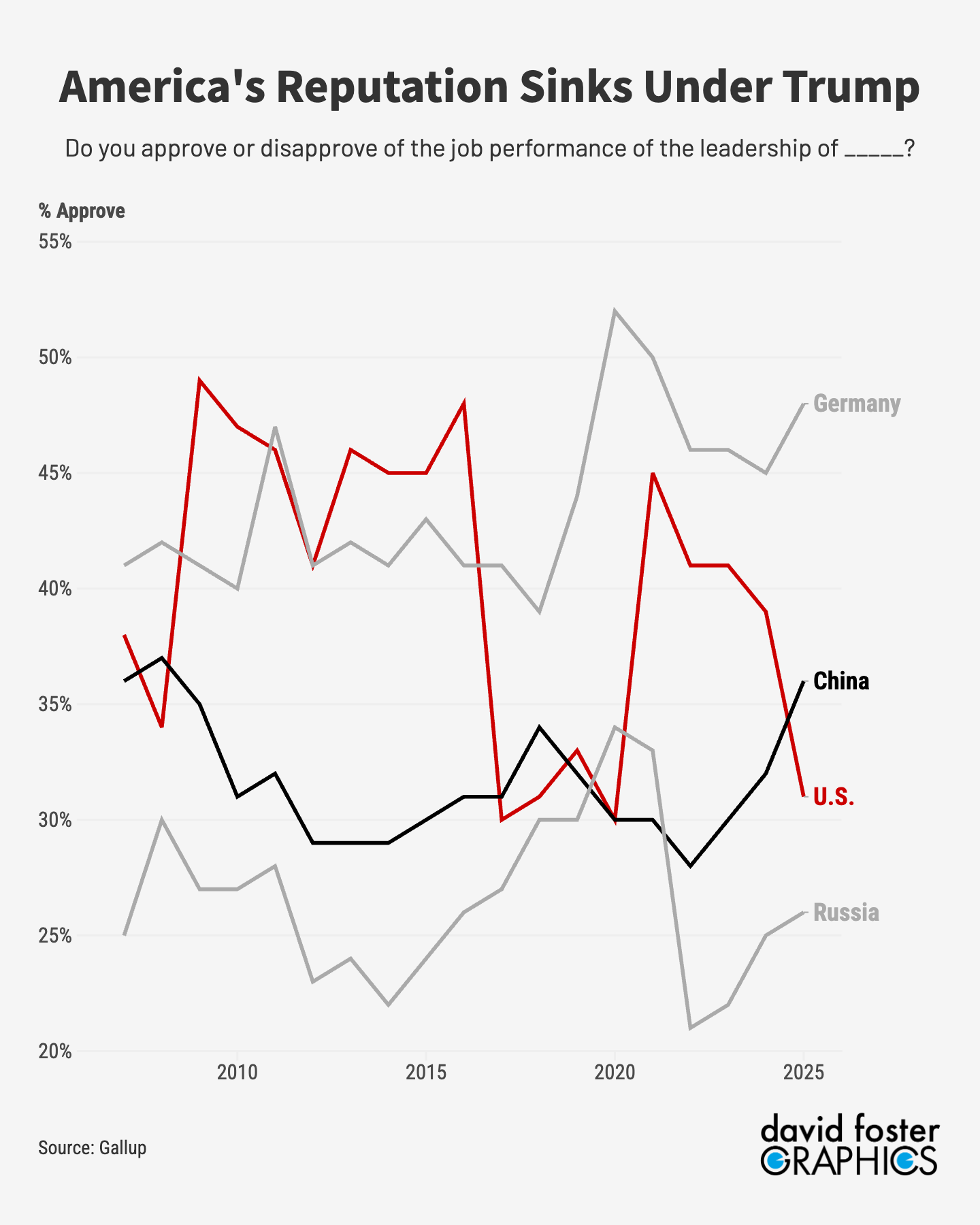 China trumps America. America’s reputation stinks, according to Gallup survey data from more than 130 countries. Every year, Gallup logs approval ratings for the leaders of the United States, China, Germany and Russia. And for the first time, approval of the United States has dropped below that of China. Just 31% of global residents approve of the United States under President Trump, while 36% approve of China under President Xi Jinping. The only time the US rating was lower was in 2020, the last year of Trump’s first term, and the year of the Covid outbreak.