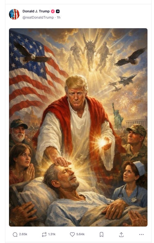 Our Lord and Savior Jesus Trump. President Donald Trump gave the Internet a priceless gift on April 12 by publishing a social-media post featuring a goofy, AI-generated image of himself as Jesus Christ, administering to an ailing man. The outrage was predictable and loud. And the mockery was hilarious.