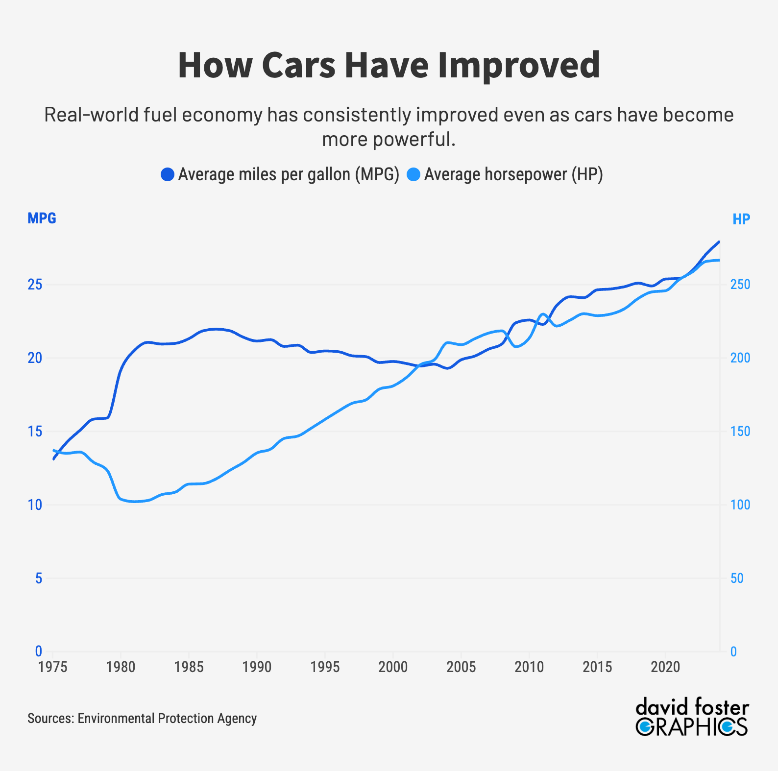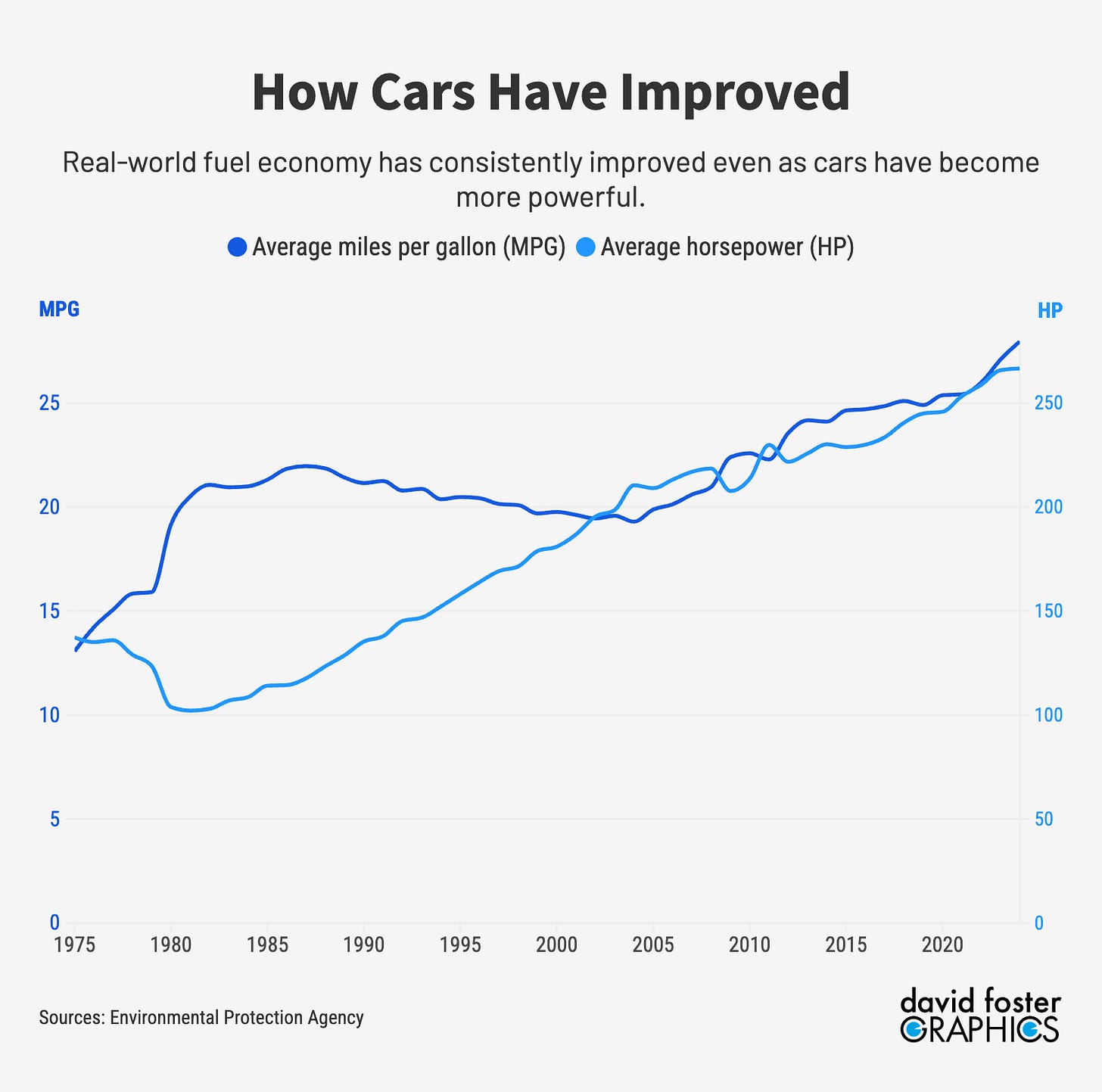 All of this maneuvering has actually led to more efficient vehicles. Real-world mileage (which differs from the government requirements for technical reasons) now averages about 28 MPG, more than double the average of the 1970s. That saves drivers money, since they use less gas. Cars are more powerful, too. Innovation has generated terrific advancements in efficiency, driveability and safety.