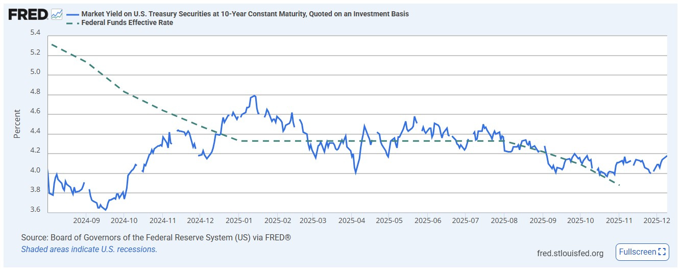 Investors now think there will be at least one more quarter-point cut in 2026, with a chance of two. But these estimates change all the time based on what the data on jobs, inflation and growth shows. More important for most people is what long-term, not short-term, rates will do, and most forecasters think they’ll stay about where they are. The 10-year Treasury is around 4.2% and the average 30-year mortgage is around 6.25%. The Fed doesn’t directly control those rates, which have disconnected from short-term rates during the last 18 months, as this chart shows.