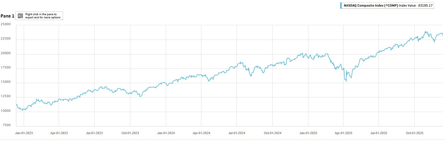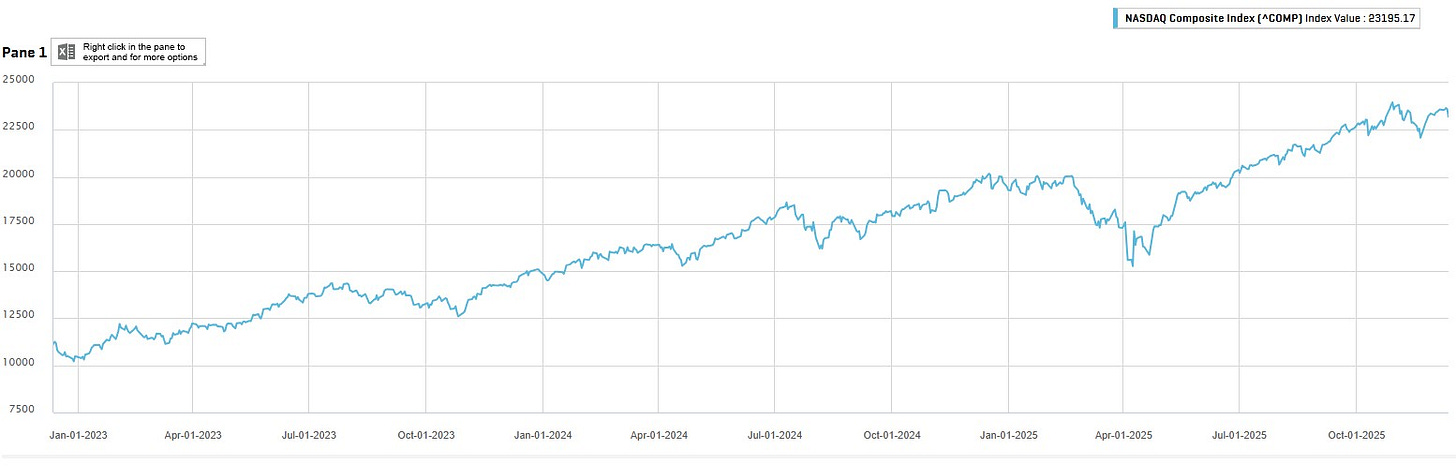 And here’s a chart of the 3-year NASDAQ stock index, which hit its all-time record high on October 29. Note that every downdraft has been short-lived. The worst began in April of this year, and that was a man-made mess caused solely by President Trump’s rollout of insanely high tariffs.