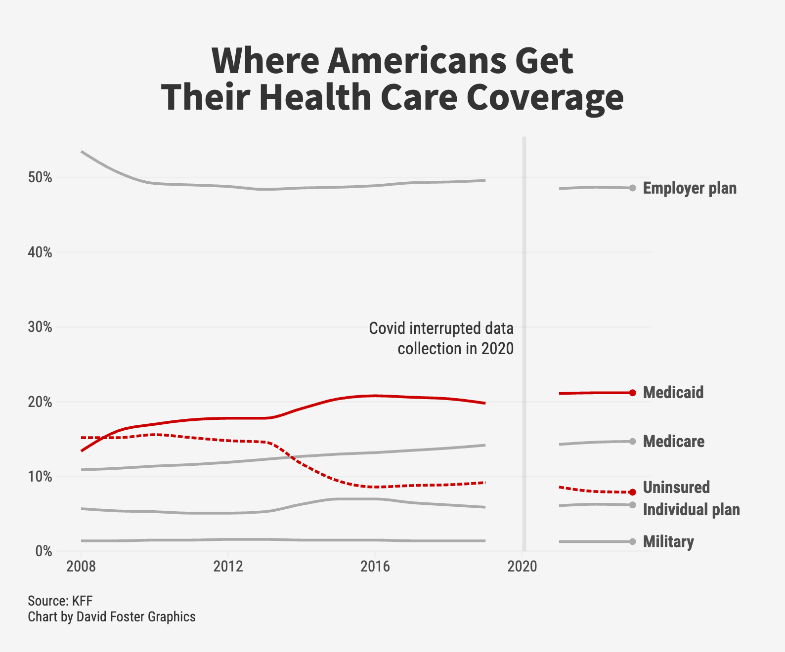 The biggest change in coverage under the ACA has been a surge of people covered under Medicaid, the insurance program for the poor. The ACA expanded Medicaid eligibility so that more adults would qualify. The portion of Americans covered by Medicaid jumped from 13.4% in 2008 to 21.2% in 2023, the last year for which data is available. Graphics guru David Foster put the data into this chart: