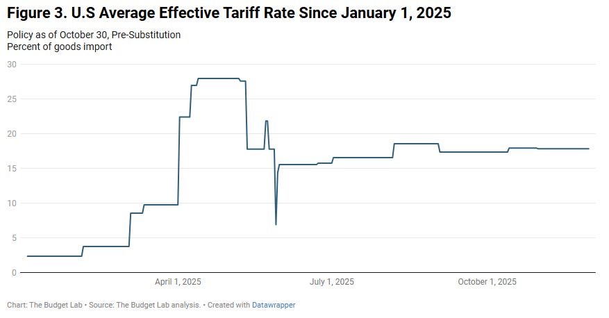 Trump wants the tariff revenue. Trump has repealed some of the steepest tariffs, but taxes on imports are still up by a lot since he took office in January. The overall tax on imports has risen from 2.5% to 17.2%, according to the Yale Budget Lab, as the chart above shows. The average tax on imports from China has jumped from 21% to about 47%, even in the aftermath of the trade truce. That level of import taxes will raise about $300 billion per year in new federal revenue. Trump wants to tap that kitty for a variety of pet causes, such as aiding farmers, supplementing food assistance or paying troops left dry by the government shutdown. He probably needs Congress to authorize such spending, but Republicans who control Congress might do that, since their own constituents would benefit from getting a cut of the tariff jackpot.